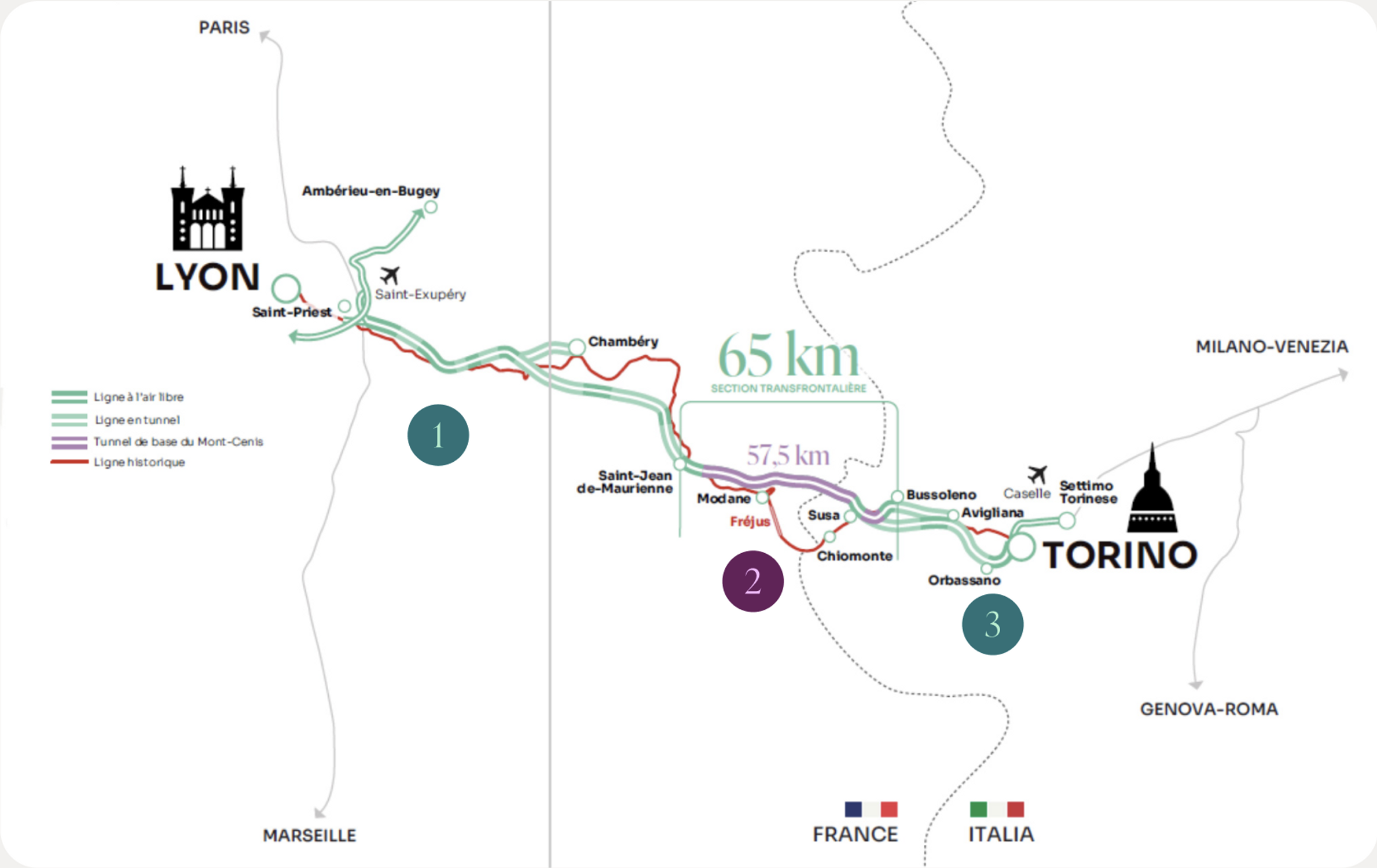 Cette ligne de 270 km s’articule autour d’un élément central : la section transfrontalière, pilotée par TELT, et son infrastructure majeure, le tunnel de base du Mont-Cenis, qui deviendra, avec ses deux tubes de 57,5 km, le plus long tunnel ferroviaire au monde.